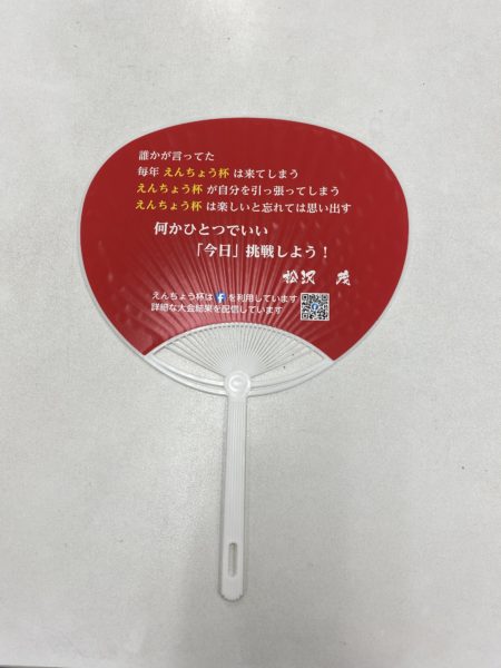 赤と黄色が主催者を感じさせるえんちょう杯団扇を頂きました。