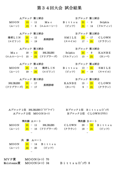 変わって、Bブロックは強豪の絶対安定のBittsu(君津市)、多彩な攻撃を放つSMILE(鋸南町)がセットを争い、2大会ぶりの参加となるこれもまた強豪のCLOWN(南房総市)がその実力を見せ、SMILE(鋸南町)と引き分け、Bittsu(君津市)がDolphin(大多喜町)に2セットを取り勝利し、1位通過。そして、CLOWN(南房総市)が同郡のKANBE(館山市)に2セットを取り、2試合とも引き分けたSMILE(鋸南町)を下し、決勝トーナメントに進出しました。